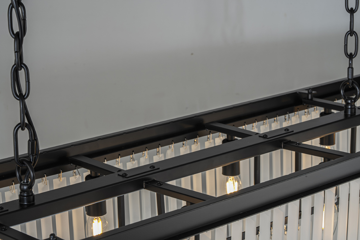 Прямоугольный подвесной светильник Delight Collection Odeon 10C/P black/frost на арматуре из металла черного цвета. Плафон состоит из множества подвесок-пластин из белого матового стекла расположенных на двух уровнях. Размер потолочного крепления 85x12x2,5 см.