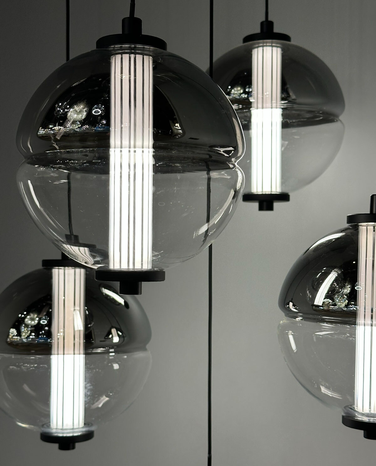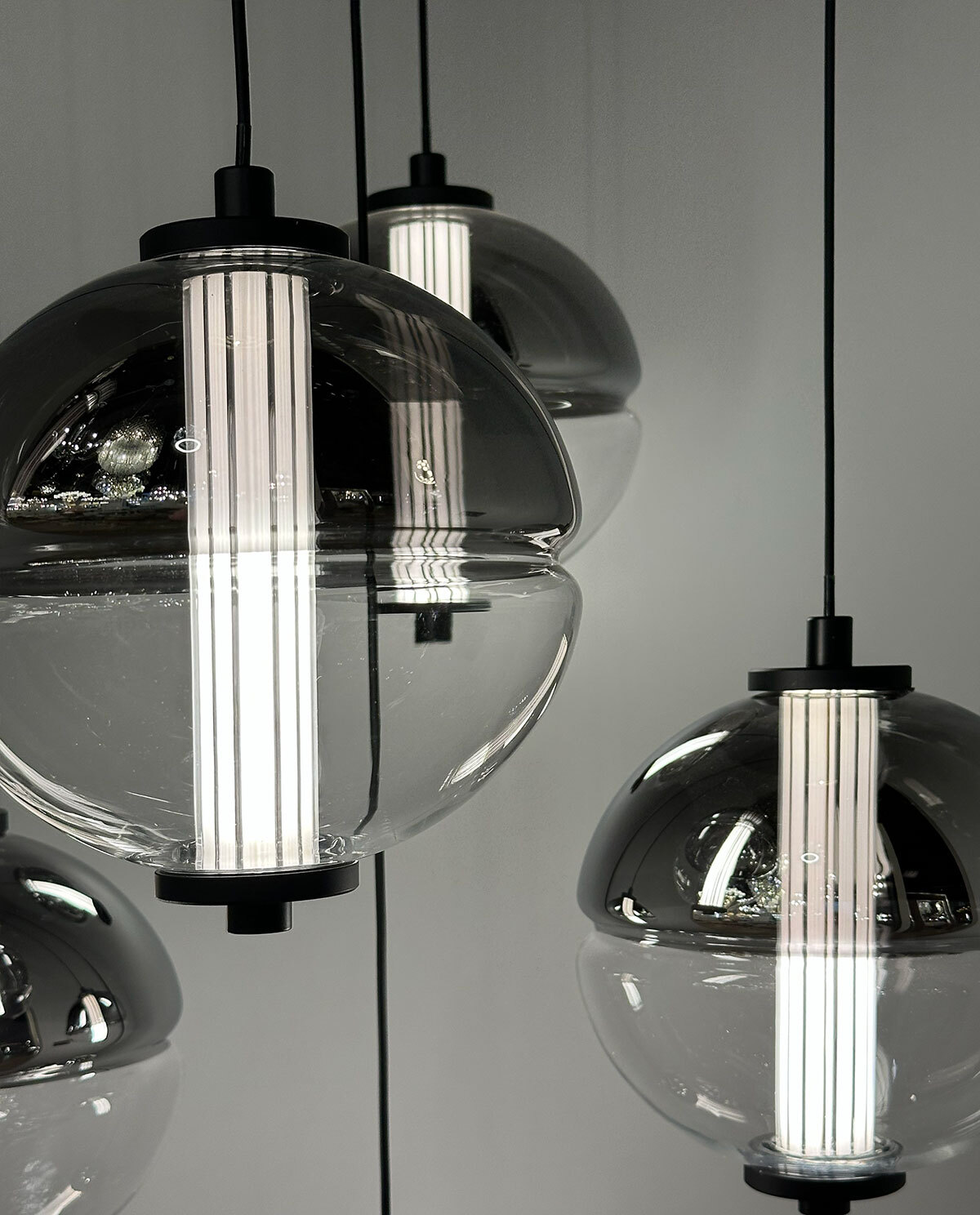 Подвесной светильник Delight Collection MD24022079-3B black/smoky с тремя подвесами на планке из металла черного цвета. Плафоны из стекла двух цветов: прозрачного и дымчатого. Внутри плафонов рассеиватели из прозрачного акрила. Диаметр плафона 16 см.