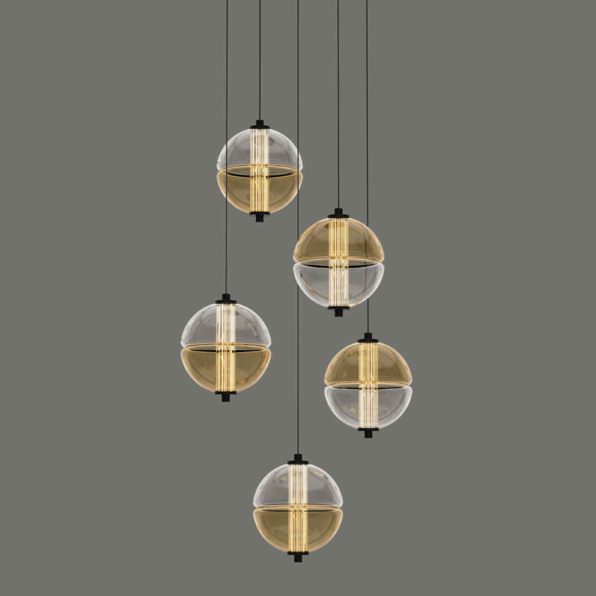Подвесной светильник Delight Collection MD24022079-5A black/amber с пятью подвесами на круглом основании черного цвета. Плафоны из стекла двух цветов: прозрачного и янтарного. Внутри плафонов рассеиватели из прозрачного акрила. Диаметр плафона 16 см.
