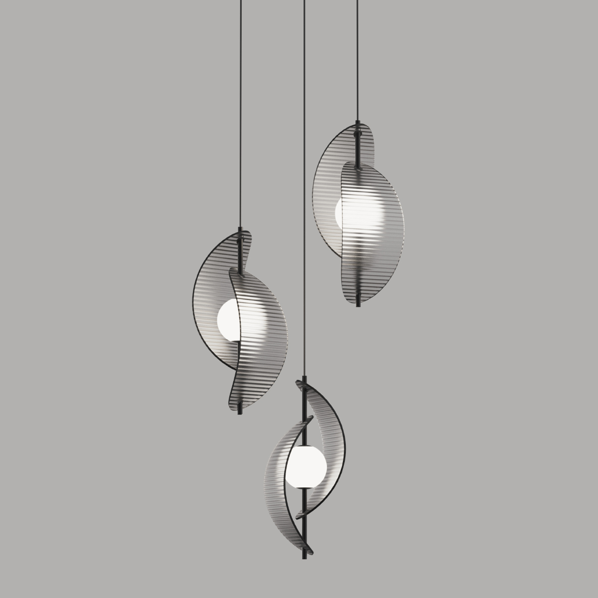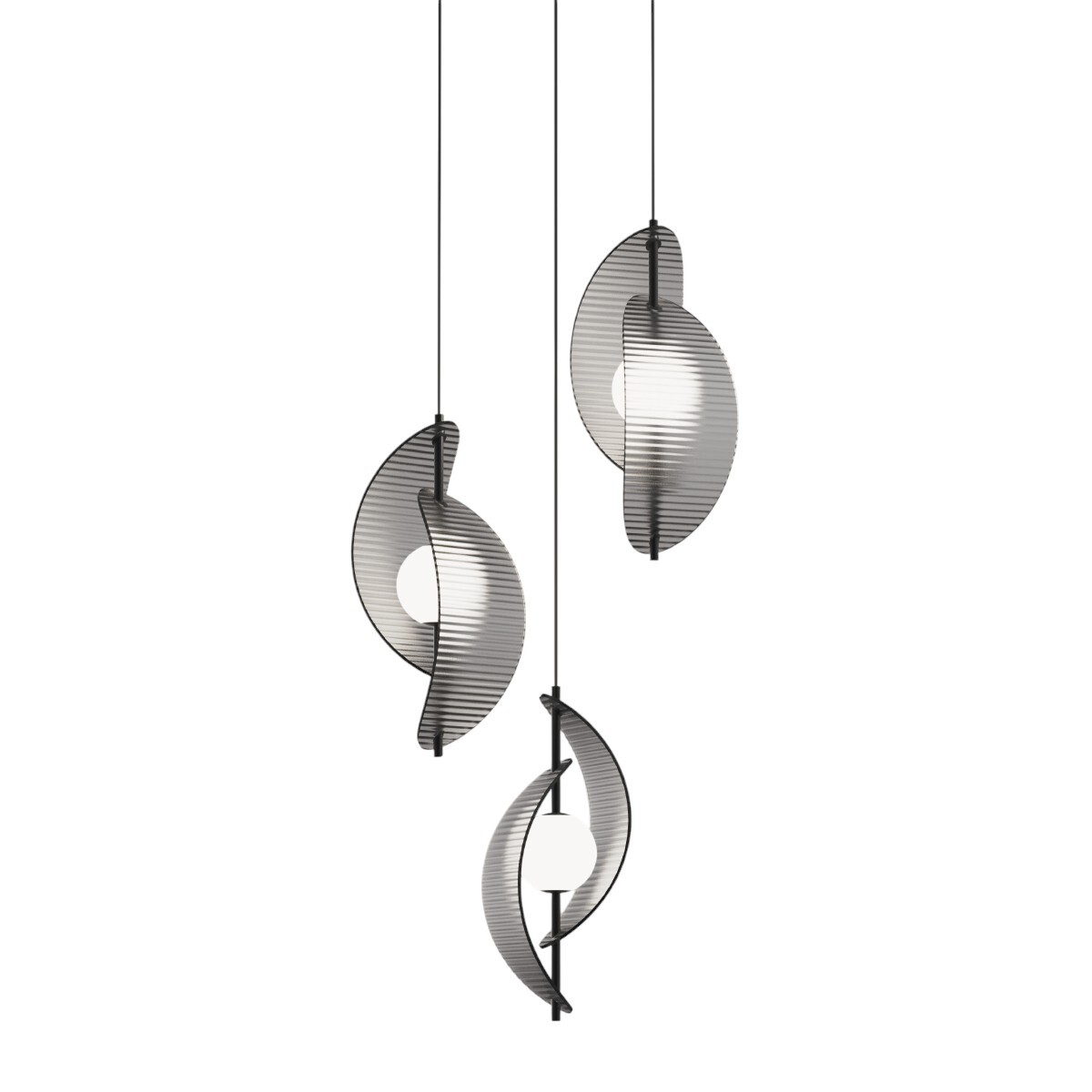 Подвесной светильник Delight Collection MD24030035-3A black/smoky с тремя подвесами на круглом основании черного цвета. Подвесы с двумя элементами из рифленого стекла дымчатого цвета и шарообразным плафоном из белого стекла между ними.