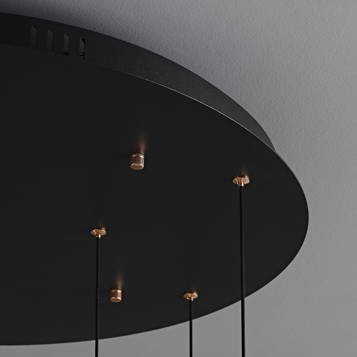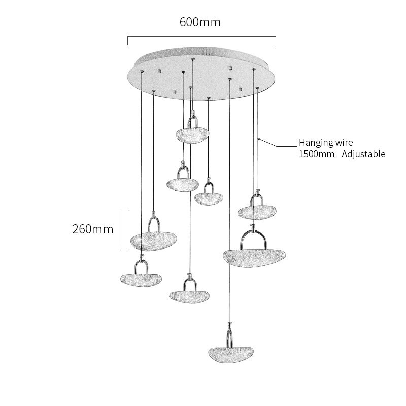 Подвесной светильник Delight Collection MT9125-9H french gold с 9-ю подвесами из фактурного акрила разного размера. Крепления подвесов из металла золотого цвета. В каждом подвесе находится светодиодный источник света. Основание светильника черного цвета, диаметр 60 см.